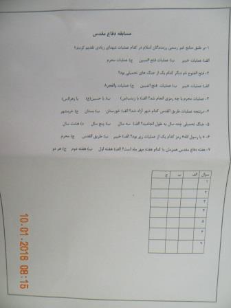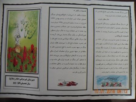 در تاریخ 95/7/10 ، روز شنبه ، مسابقه بزرگداشت هفته دفاع مقدس بین دانش آموزان آموزشگاه برگزار گردید که 20 نفر به طور کامل به سوالات پاسخ صحیح دادند که جوایزی به رسم یاد بود اهدا شد.