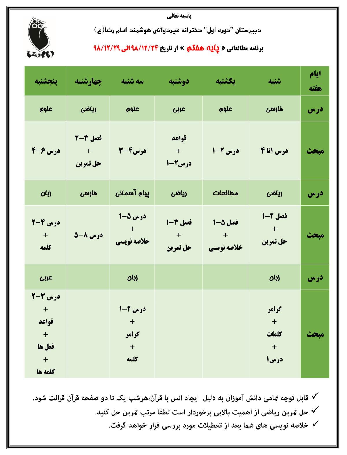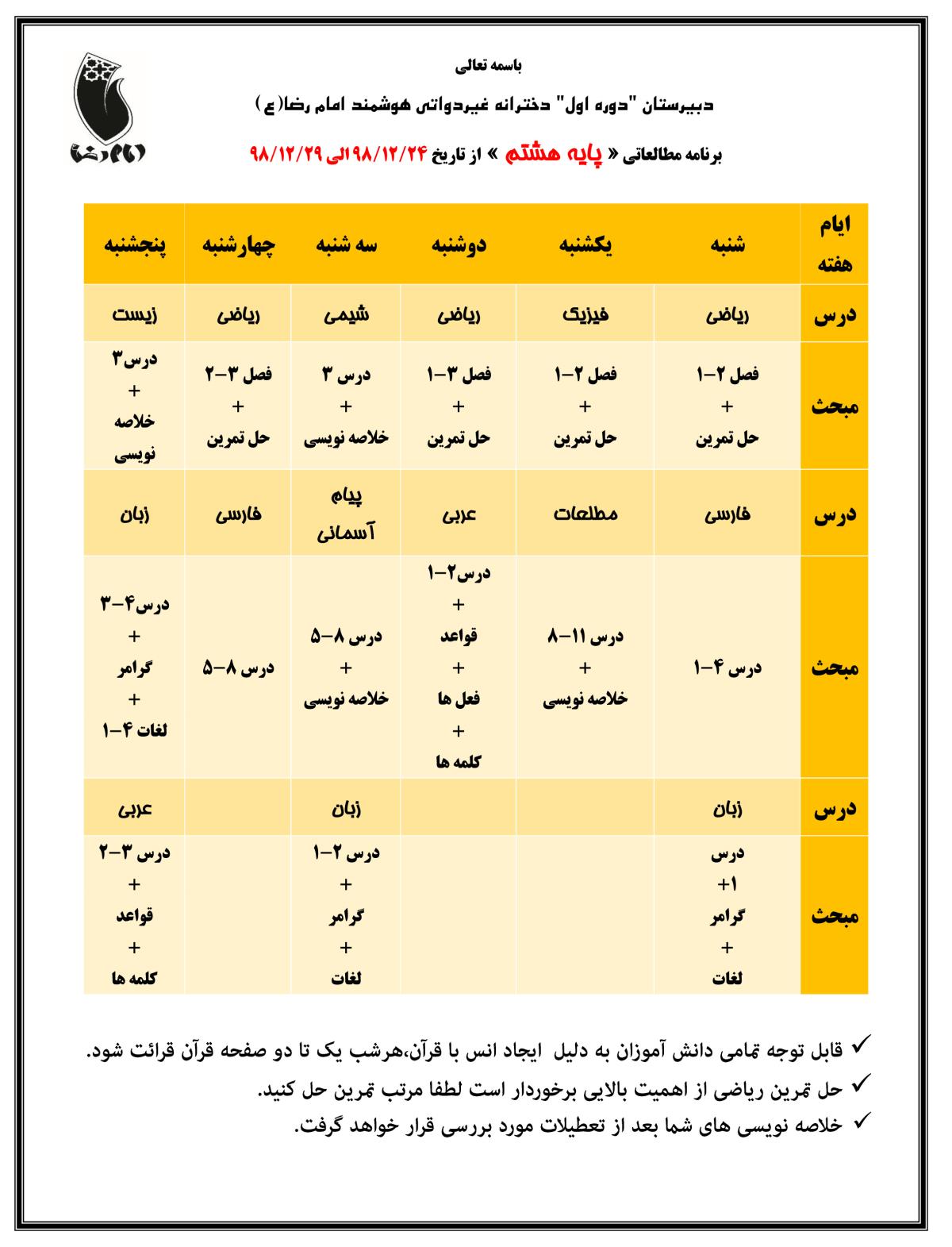 برنامه مطالعاتی از تاریخ 98/12/24 تا 98/12/29
