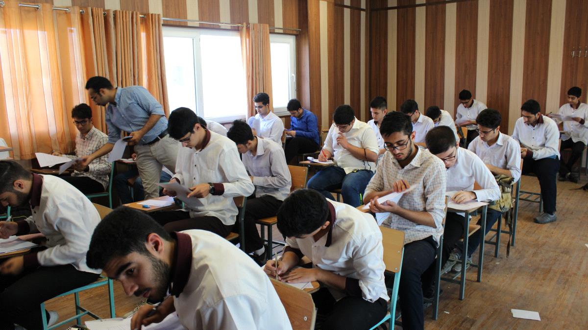 حضور دانش آموزان پایه دوازدهم در ازمون های روزانه مدرسه.هدف از برگزاری این آزمون ها پیگیری مستمر مطالعاتی دانش آموزان و مقابله با انباشته شدن مباحث درسی می باشد.