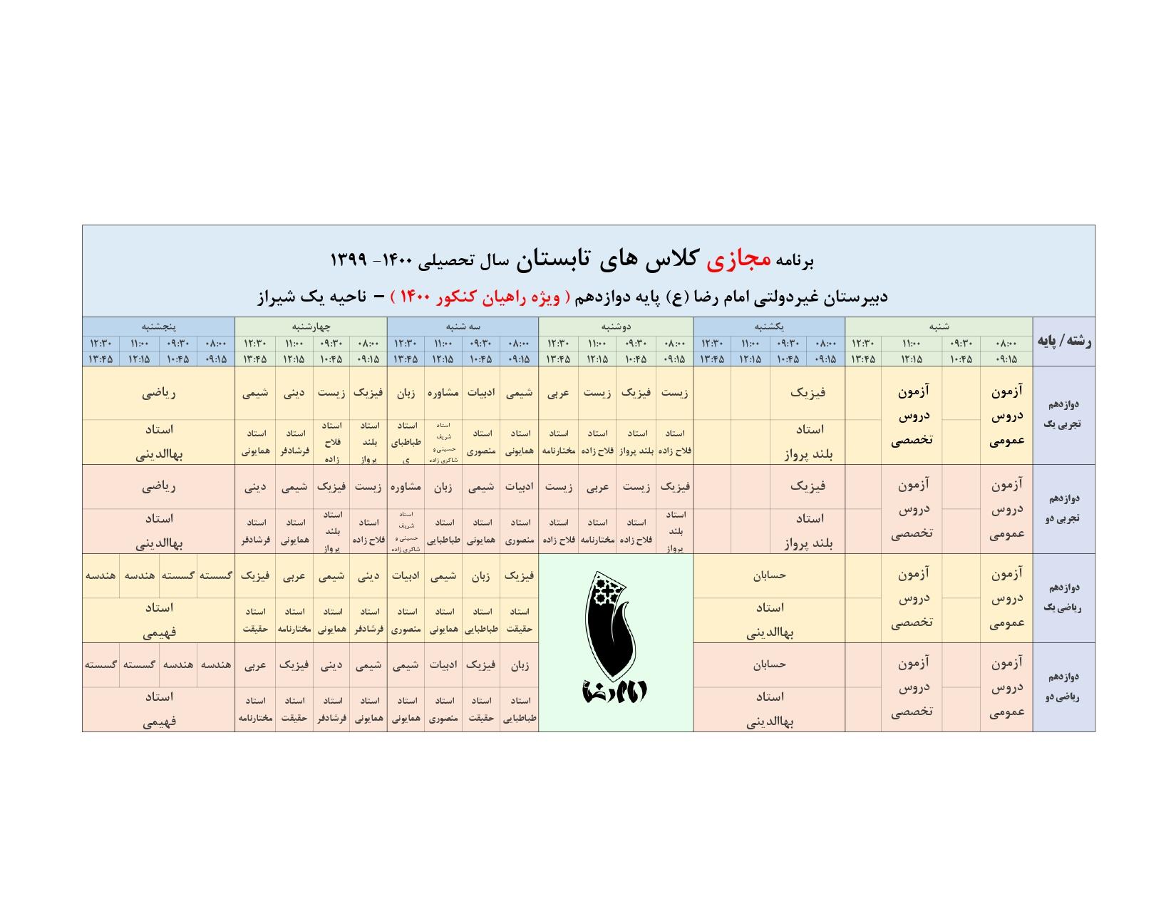 برنامه مجازی کلاس های تابستان پایه دوازدهم - سال تحصیلی 1400-1399