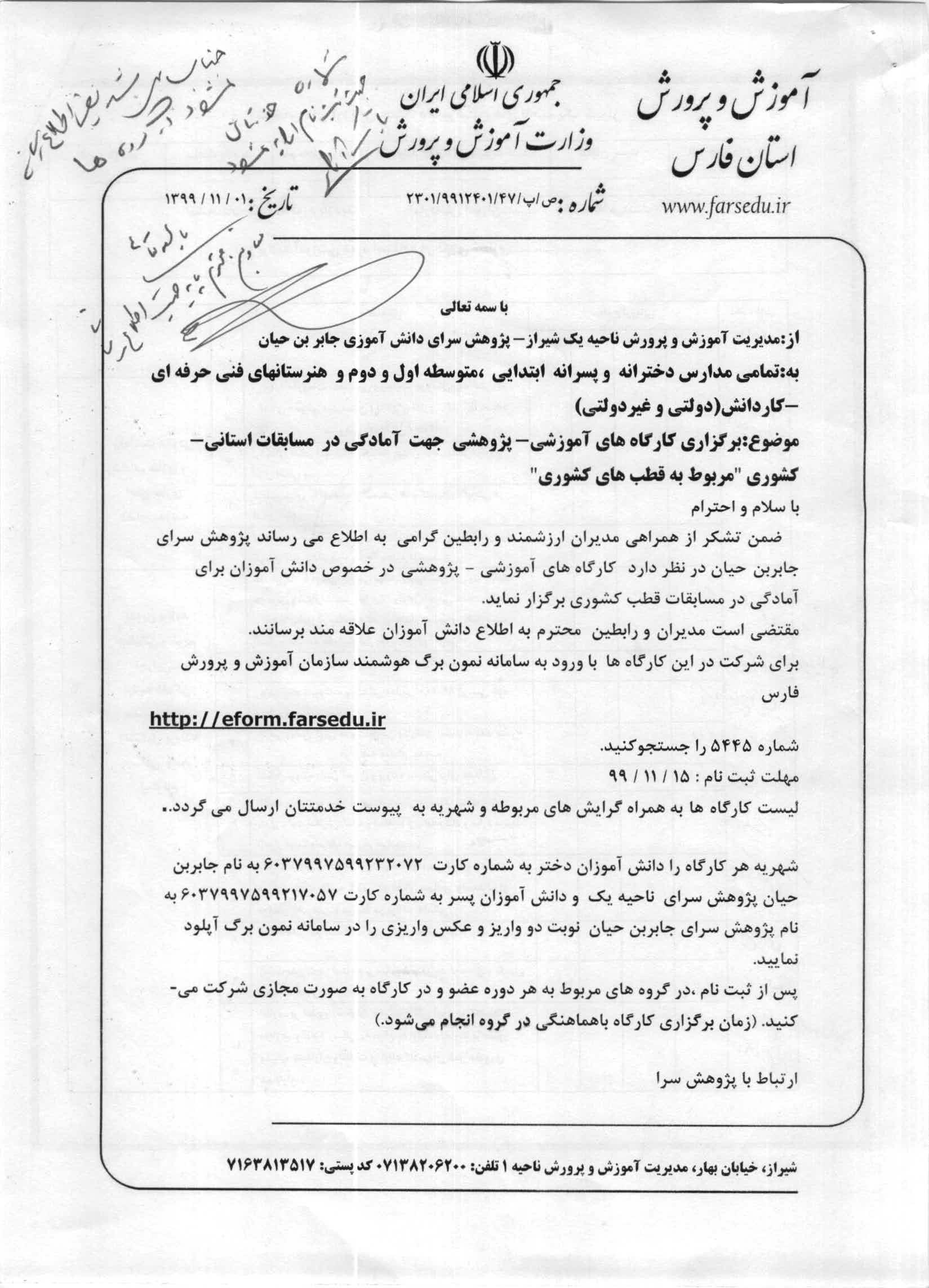 برگزاری کارگاههای آموزشی - پژوهشی جهت آمادگی در مسابقات استانی- کشوری "مربوط به قطب های کشوری"