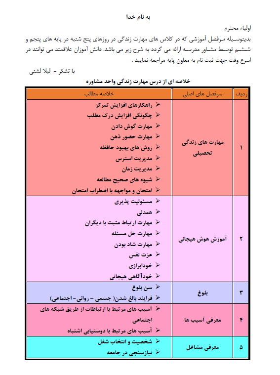 سرفصل آموزشی کلاسهای مهارت زندگی