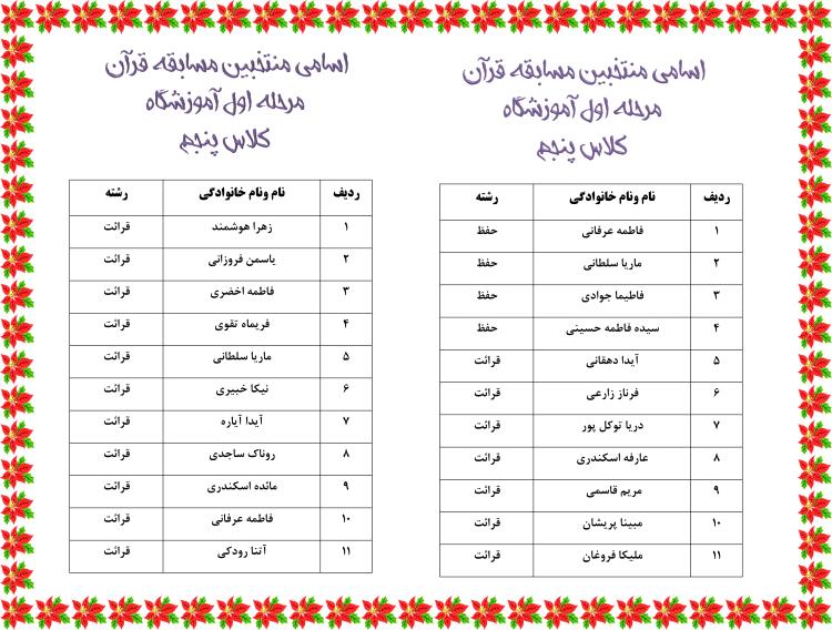 احترام اسامی منتخبین مسابقات قرآن مرحله اول آموزشگاه اعلام می گردد.