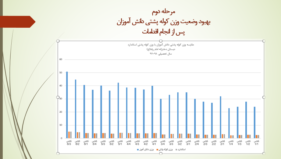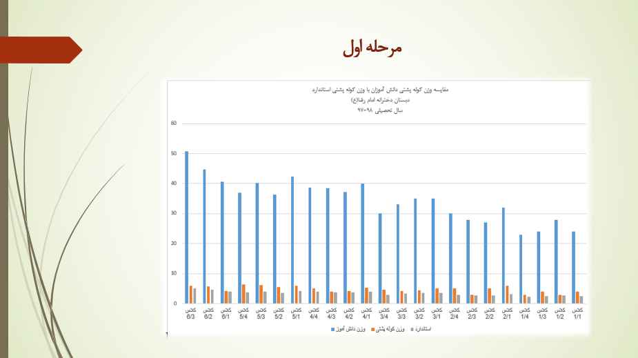 همانگونه که مستحضر هستید، کوله پشتی دانش آموز یکی از دغدغه های والدین و اولیای مدارس است، چرا که دانش اموزان تقریبا ۹ ماه از سال را هر روز کوله پشتی خود را حمل می کنند و اگر این کوله پشتی مناسب نباشد یا وزن ایده آل نداشته باشد می تواند بسیار مشکل ساز شود چرا که دانش آموزان مخصوصا در سنین ابتدایی، در حال رشد هستند و عدم دقت در انتخاب و حمل درست کوله پشتی می تواند به رشد اسکلتی آنان آسیب برساند. به همین منظور در دبستان دخترانه امام رضا (ع) وضعیت وزن کوله پشتی ها به تفکیک کلاسها بررسی گردید و با توجه به نداشتن وزن استاندارد پس از جلسات متعدد با آموزگاران و ارائه آموزشهای لازم به دانش آموزان و همکاری معاونین محترم با واحد بهداشت این مشکل مرتف گردید. در ذیل تصاویر مربوط آورده شده است.