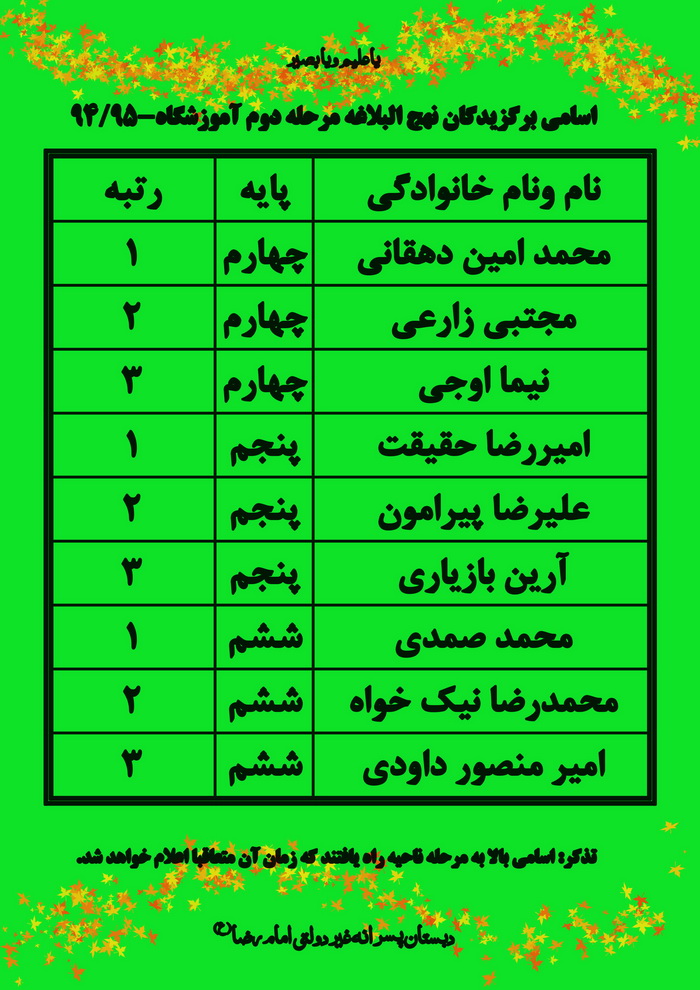 اعلام نتایج مسابقه نهج البلاغه مرحله دوم آموزشگاه