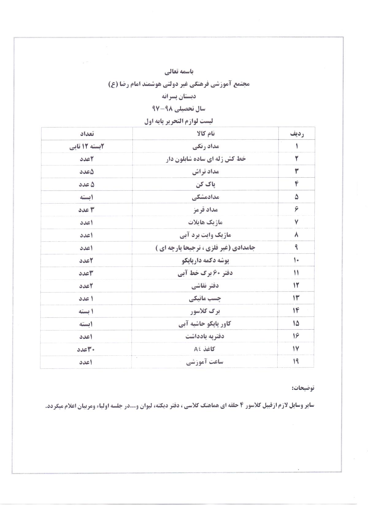 لوازم التحریر مورد نیاز دانش آموزان پایه اول