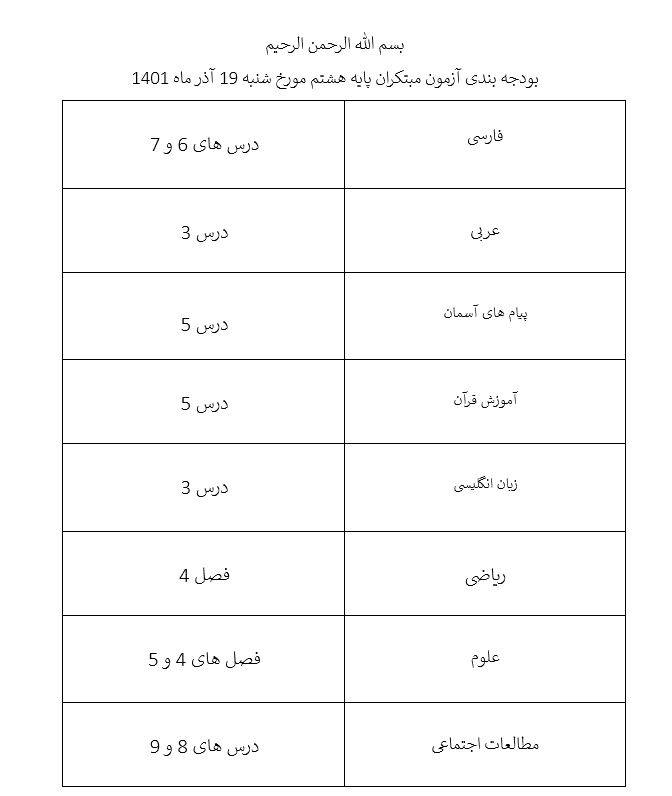 بودجه بندی آزمون مبتکران پایه هشتم مورخ 19 آذر ماه 1401
