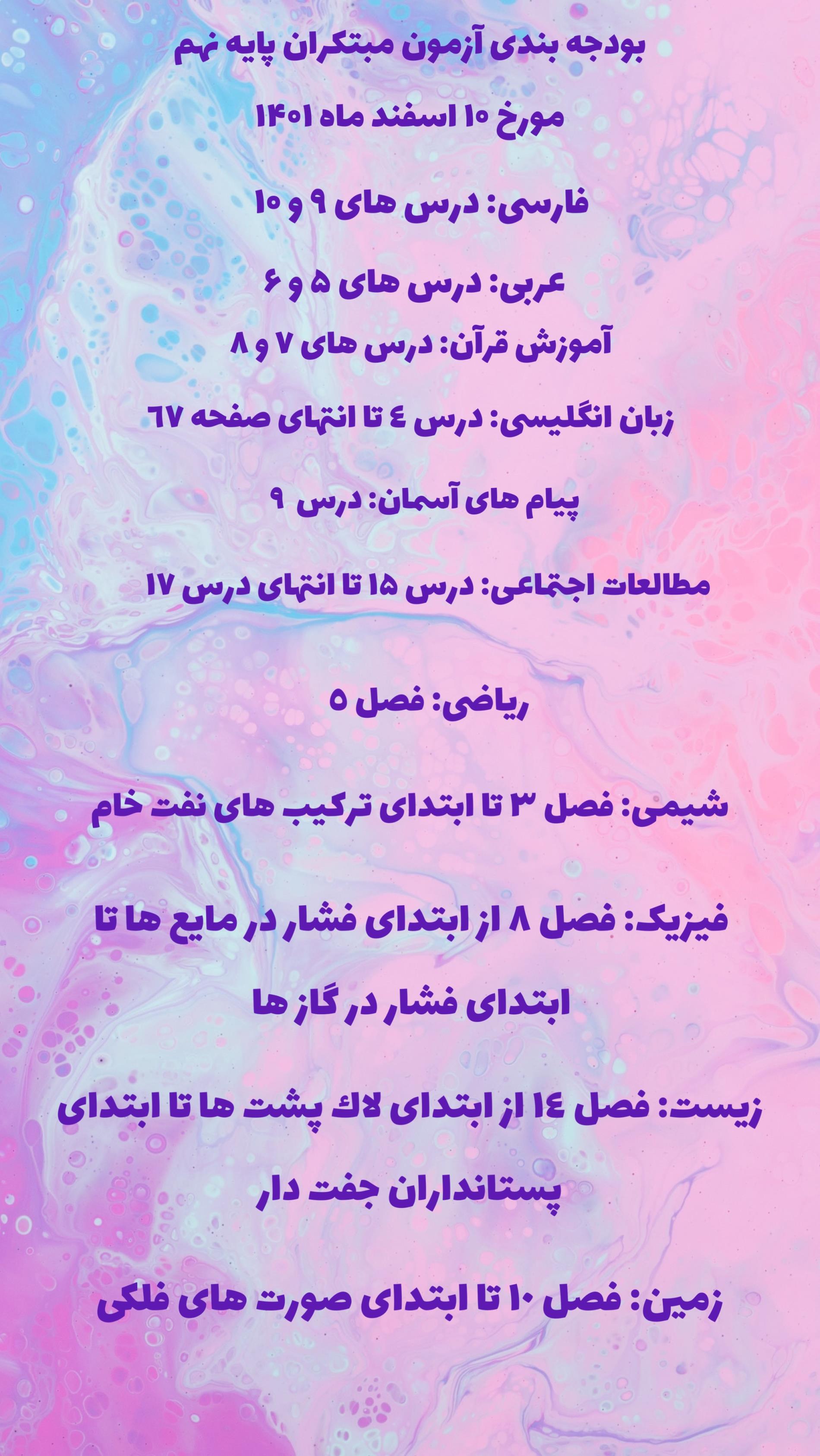 بودجه بندى آزمون مبتكران پايه نهم مورخ ١٠ اسفند ماه ١٤٠١