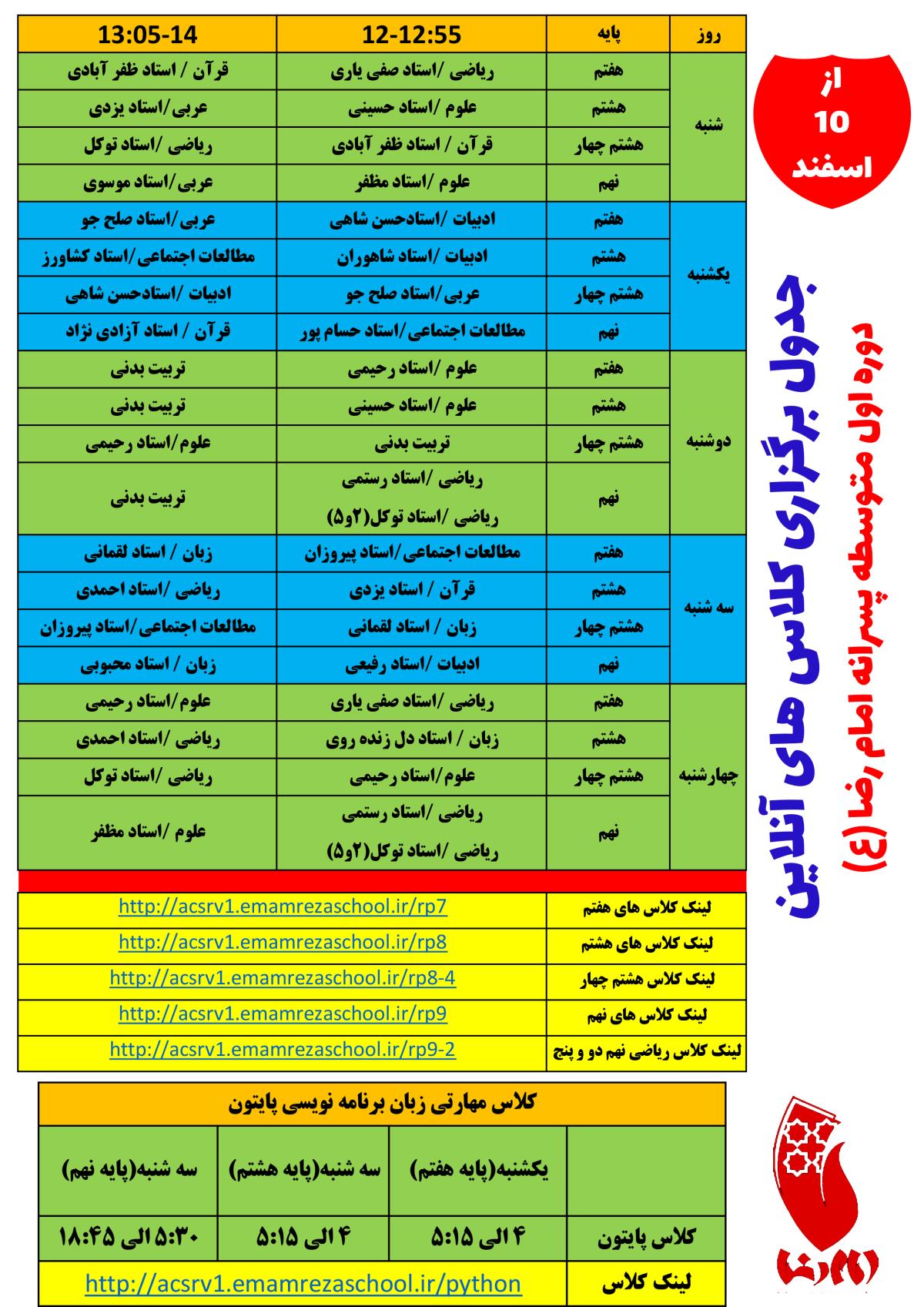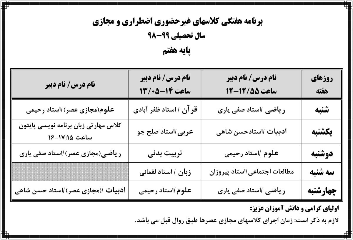 پایه هفتم-برنامه هفتگی کلاسهای غیرحضوری اضطراری و مجازی