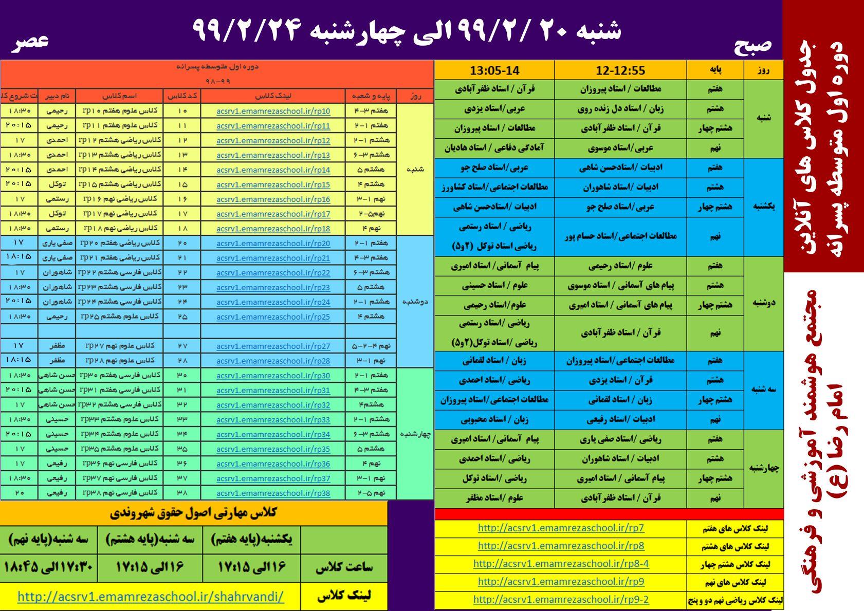 جدول کلاس های آنلاین شنبه 20 اردیبهشت الی چهارشنبه 24 اردیبهشت 1399