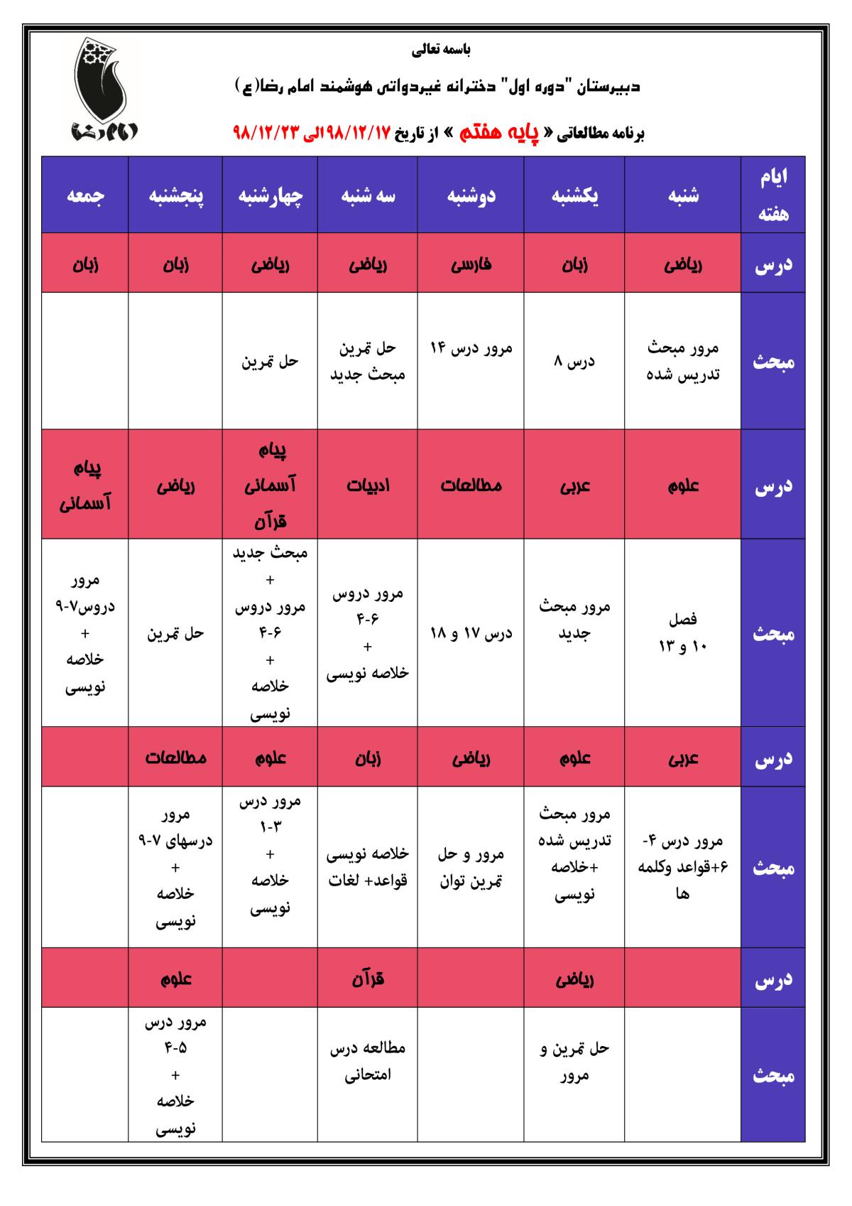 برنامه مطالعاتی « پایه هفتم » از تاریخ 17/12/98 الی 23/12/98