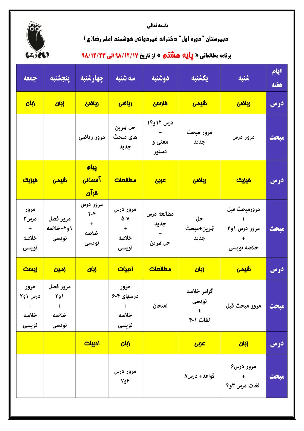 برنامه مطالعاتی « پایه هشتم » از تاریخ 17/12/98 الی 23/12/98