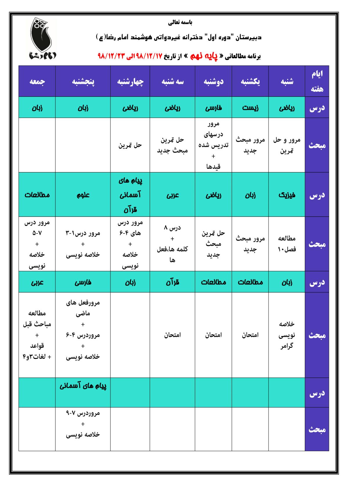 برنامه مطالعاتی « پایه نهم » از تاریخ 17/12/98 الی 23/12/98