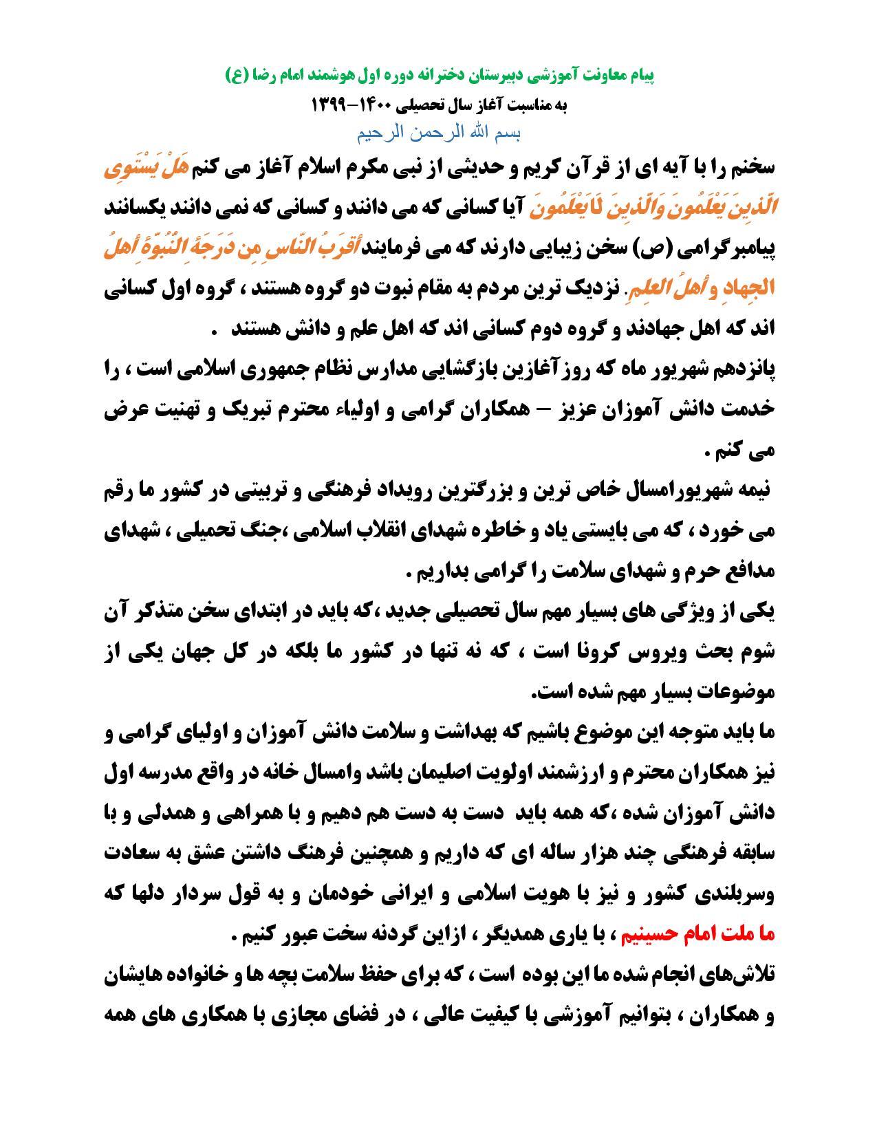 پیام معاونت آموزشي دبيرستان دخترانه دوره اول هوشمند امام رضا (ع)