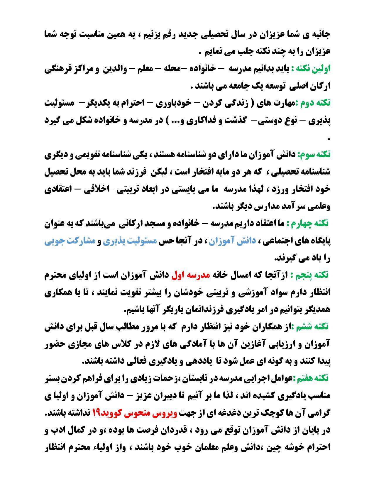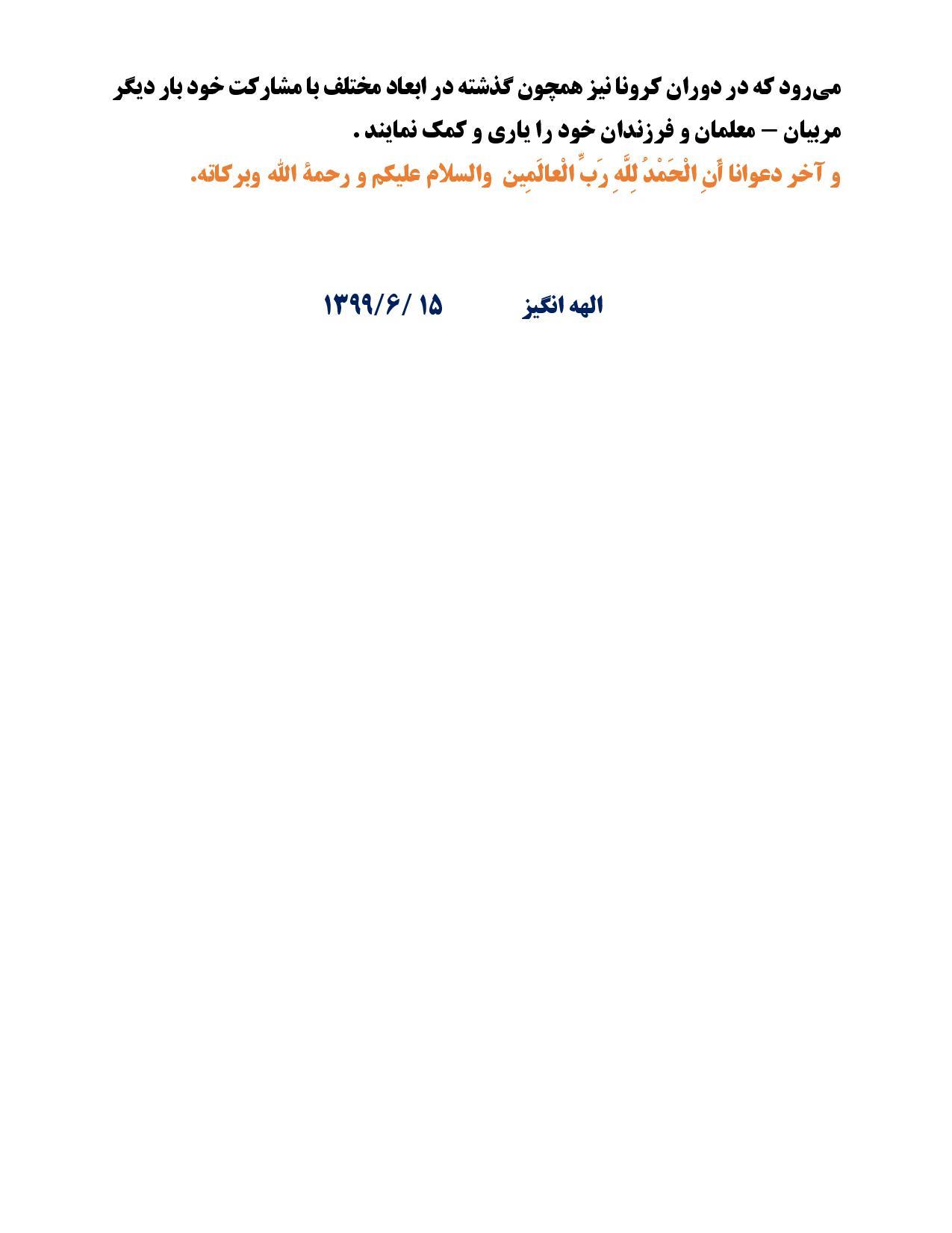 ما باید متوجه این موضوع باشيم که بهداشت و سلامت دانش آموزان و اولیای گرامی و نیز همکاران محترم و ارزشمند اولویت اصلیمان باشد وامسال خانه در واقع مدرسه اول دانش آموزان شده ،که همه باید دست به دست هم دهیم و با همراهی و همدلی و با سابقه فرهنگی چند هزار ساله اي که داريم و همچنين فرهنگ داشتن عشق به سعادت وسربلندي کشور و نيز با هویت اسلامی و ایرانی خودمان و به قول سردار دلها که ما ملت امام حسینیم ، با یاری همدیگر ، ازاین گردنه سخت عبور کنيم .