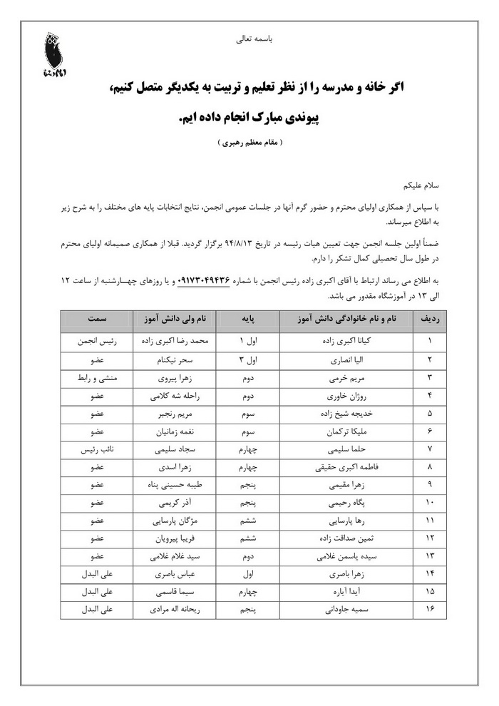 نتایج انتخابات پایه های مختلف دبستان دخترانه امام رضا(ع)- سال تحصیلی 95-94