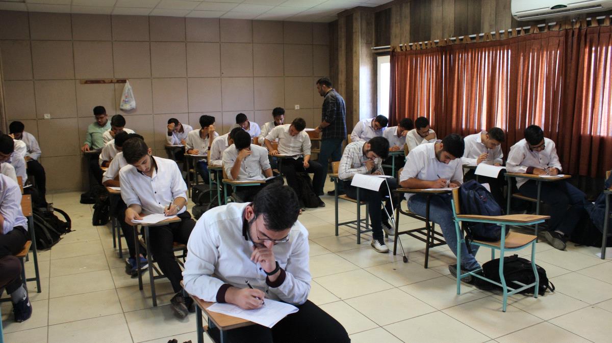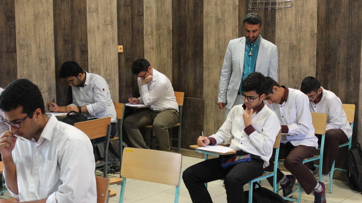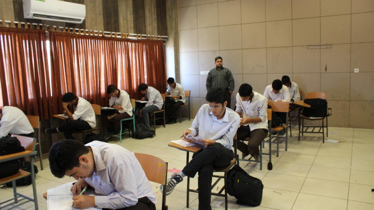 حضور دانش آموزان پایه دوازدهم در ازمون های روزانه مدرسه.هدف از برگزاری این آزمون ها پیگیری مستمر مطالعاتی دانش آموزان و مقابله با انباشته شدن مباحث درسی می باشد.