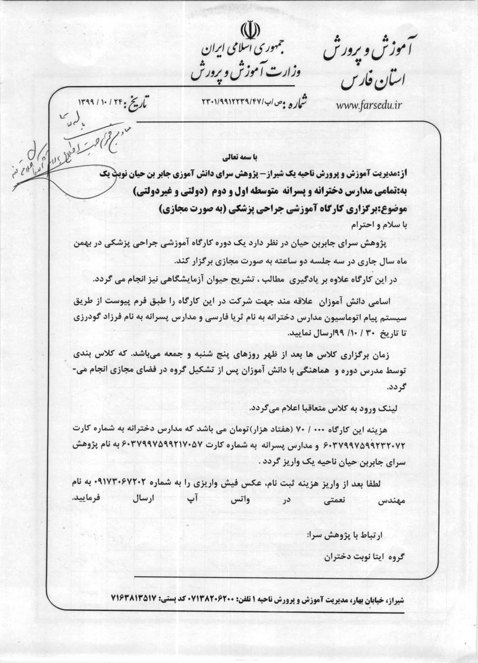 برگزاری کارگاه آموزشی جراحی پزشکی(به صورت مجازی)