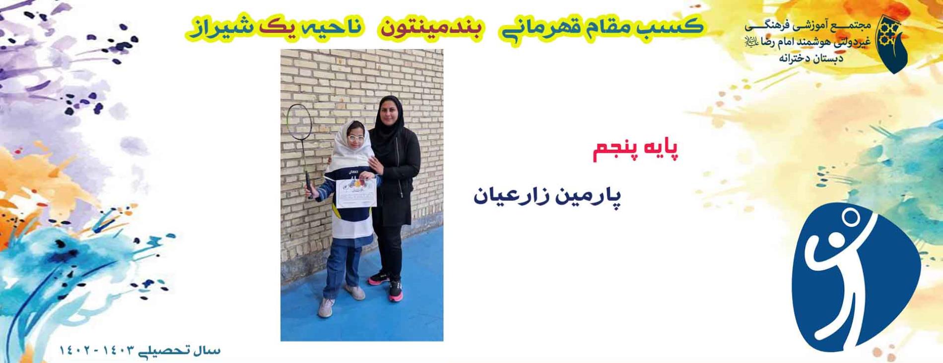قهرماني دانش آموز پارمين زارعيان دانش آموز پايه پنجم در رشته بندمينتون دبستان دخترانه