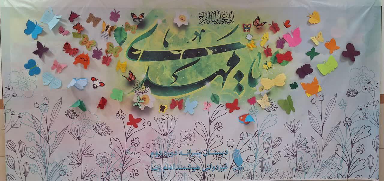 همچنین با نصب بنر بزرگ نام مبارک امام زمان(عج) دانش آموزان دل نوشته های خود را به شکل پروانه روی آن چسباندند.