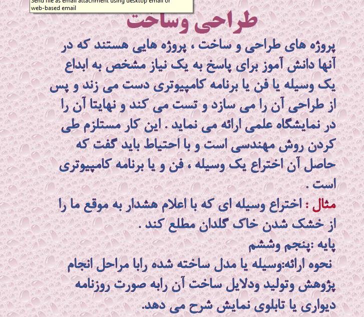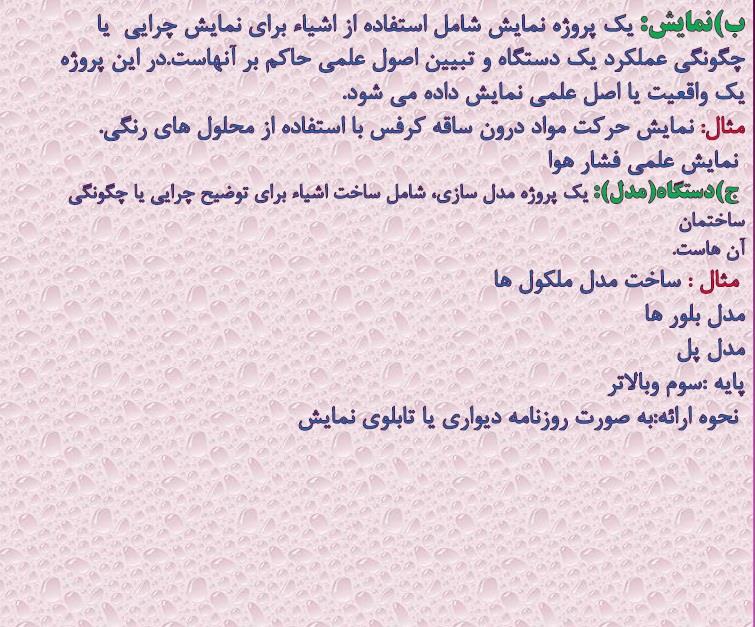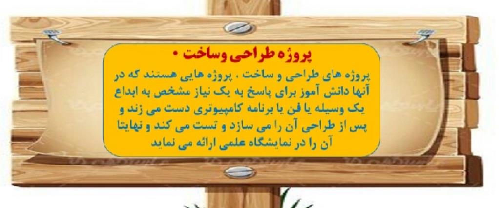 طراحی و ساخت | وسیله و یا مدل ساخته شده را با مراحل انجام پژوهش و تولید و دلایل ساخت آن به صورت روزنامه ای یا تابلو نمایش شرح می دهد . |