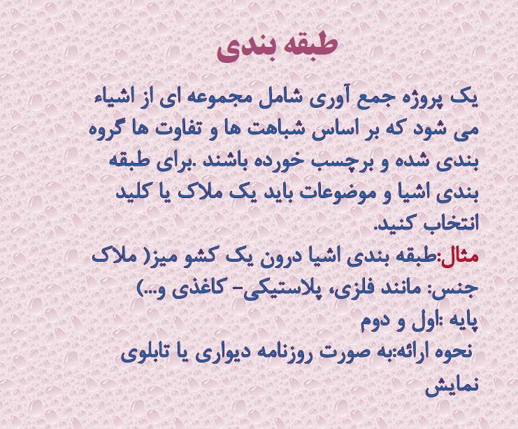مهارت های علمی پژوهشی و فناورانه | اول دوم | جمع آوری و طبقه بندی | جمع آوری مجموعه ای از اشیا بر اساس شباهت ها و یا تفاوت ها و ارائه بصورت نمایش روزنامه ای |