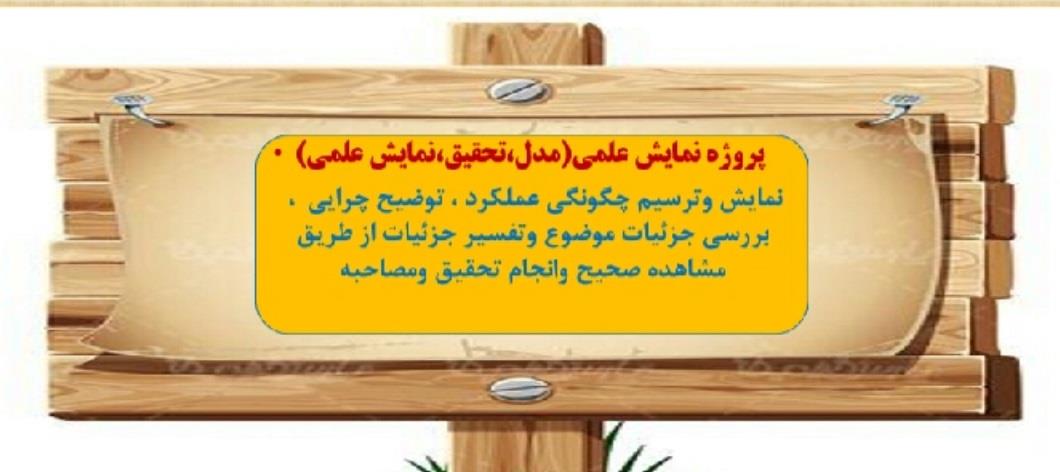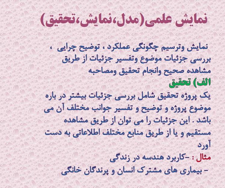دوم سوم چهارم پنجم ششم | نمایش علمی ( مدل، نمایش، تحقیق ) | نمایش و ترسیم چگونگی عملکرد، توضیح چرایی ، بررسی جزئیات موضوع و تفسیر جزئیات ازطریق مشاهده صحیح و انجام تحقیق و مصاحبه |