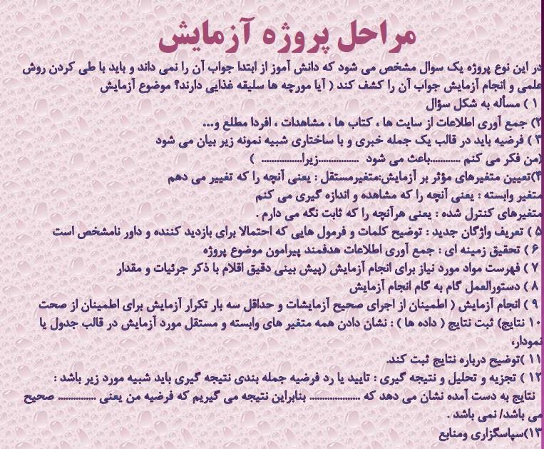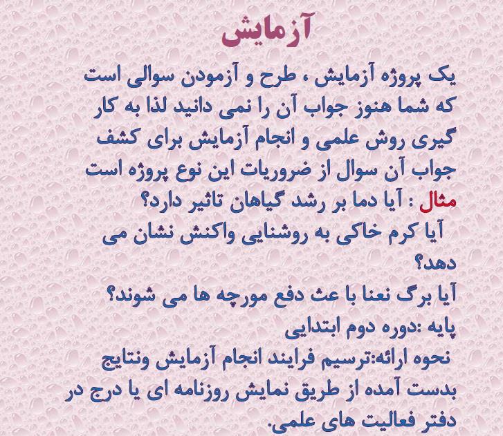 چهارم پنجم ششم | آزمایش | ترسیم فرایند انجام آزمایش و نتایج به دست آمده از طریق نمایش روزنامه ای یا درج در دفتر فعالیت های علمی |