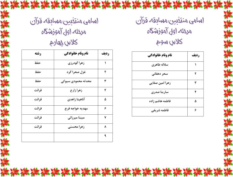 احترام اسامی منتخبین مسابقات قرآن مرحله اول آموزشگاه اعلام می گردد.